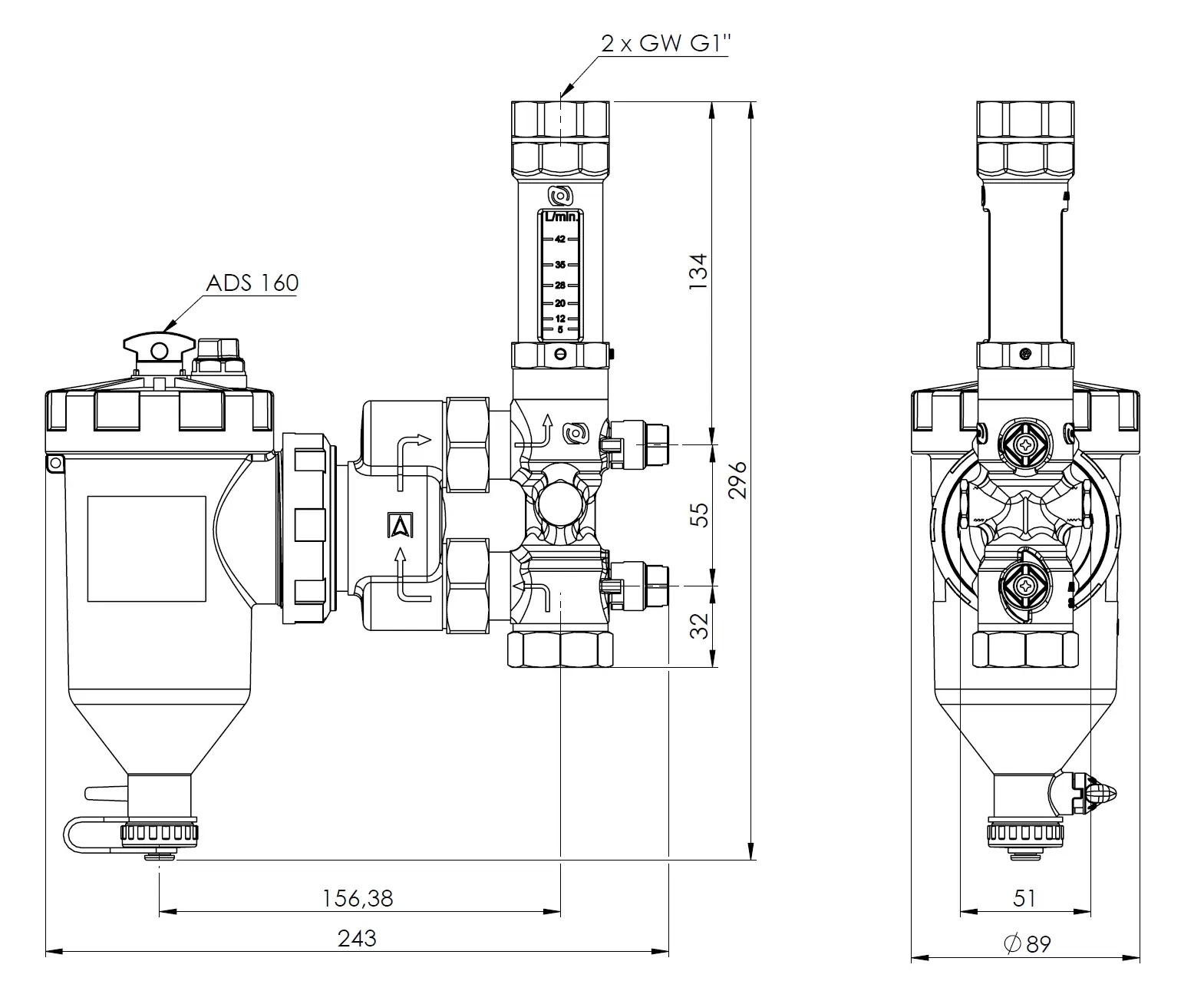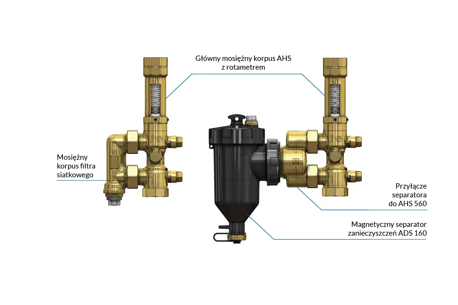 Zespół armatury serwisowej AHS 560 do pomp ciepła, z separatorem zanieczyszczeń ADS 160, z przepływomierzem 5÷42 l/min, przyłącza GW G1"