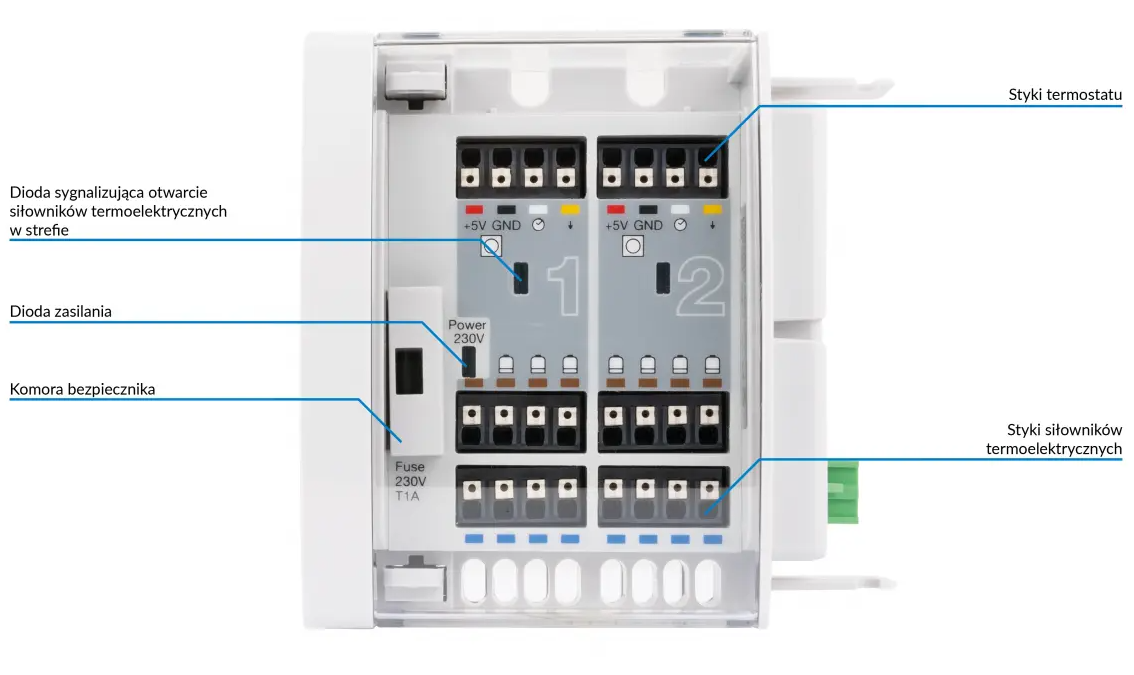 Do połączenia z modułem podstawowym BM, możliwość połączenia do 2 termostatów i do 8 siłowników termoelektrycznych. Do sterowania temperaturą w pomieszczeniach/strefach przez siłowniki dzięki sygnałom z termostatów. W zestawie opaski na przewody. Zasilanie: 230 V AC przez moduł podstawowy.