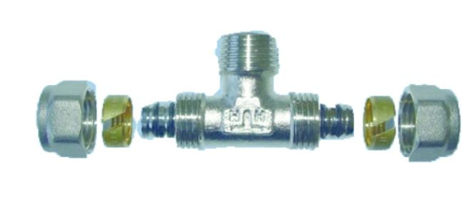 Trójnik skręcany 20x3/4 cala GZ wkład aluminiowy, ciśnienie do 1MPa, temperatura max. 95°C.