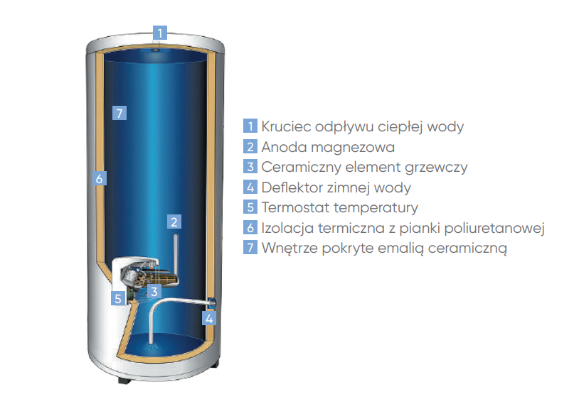 VSRS APE 200L Pojemnościowy ogrzewacz wody z ceramicznym elementem grzewczym, pojemność 200 litrów, wersja stojąca, największa akumulacja ciepłej wody, posiada dyrektywę ErP; izolacja termiczna z pianki poliurenatnowej, zapewniająca większą oszczędność energii