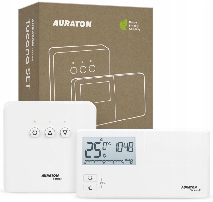 AURATON Tucana SET Zestaw - Tucana R regulator temperatury bezprzewodowy, programowalny tygodniowo, wyświetlacz LCD, oraz AURATON Fornax sterownik urządzenia grzewczego, posiada 10 programów temperatury - 3 ustawione fabrycznie oraz 7 programów