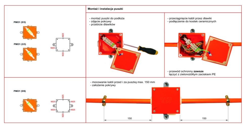 Puszka łączeniowa i rozgałęźna, Ui=400 V, z trwałym zachowaniem funkcji łączenia E30 / E60 / E90 wg DIN 4102, Stopień ochrony IP65, Zakres uszczelnienia od 7 mm do 18,5 mm, Mocowanie poprzez zewnętrzne uchwyty montażowe do betonu za pomocą kołków stalowych, Do drabinek i korytek kablowych za pomocą śruby SGKM6x12, Montaż puszki na korycie siatkowym za pomocą uchwytu puszki UP1 lub UPP... i kompletu SGNM6x12 lub SGKM6x12