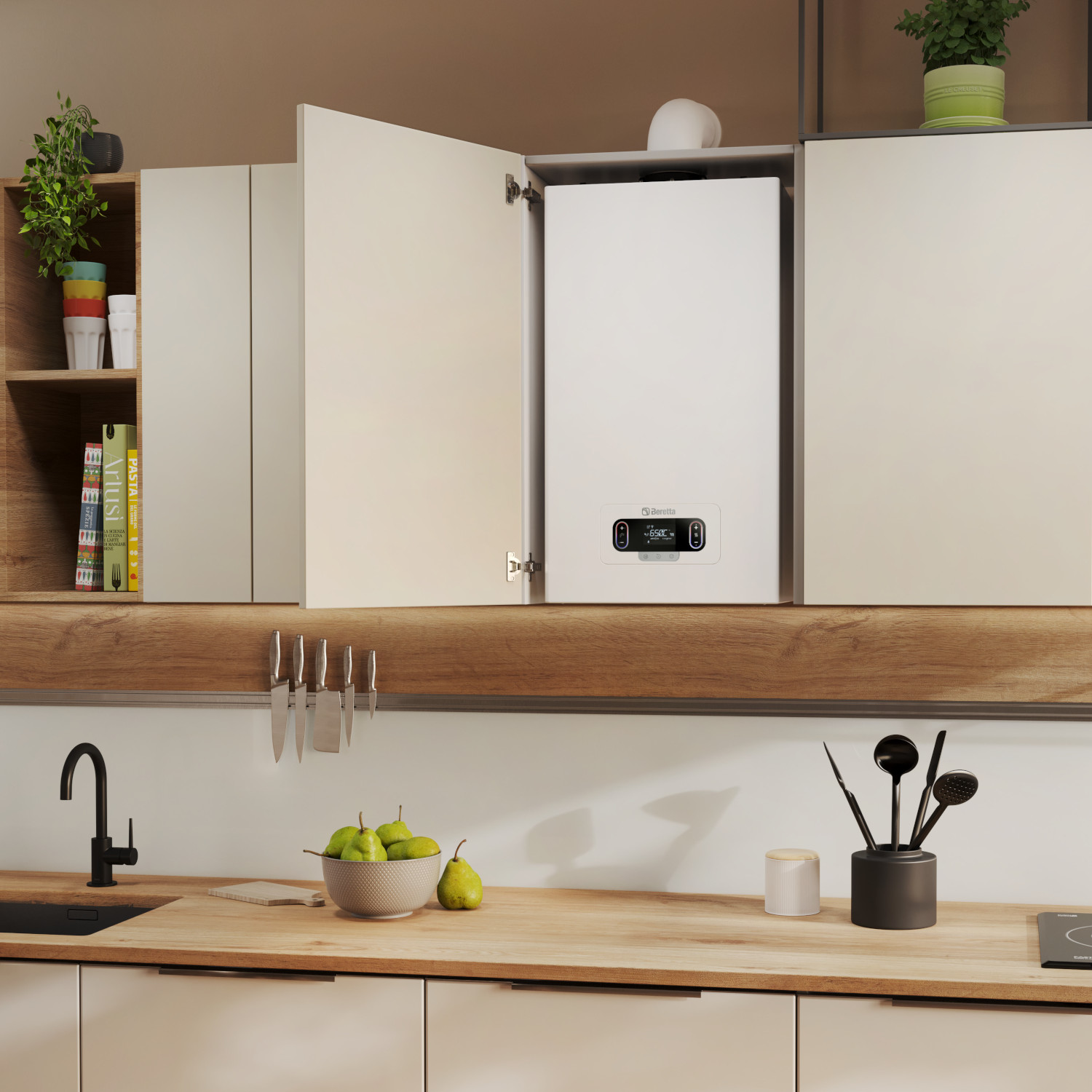 Kocioł kondensacyjny Beretta MYNUTE EVO X 30R, jednofunkcyjny, wiszący, o mocy 3,5 - 30 kW, niskim poziomie hałasu i możliwości pracy z mieszanką gazu ziemnego i wodoru