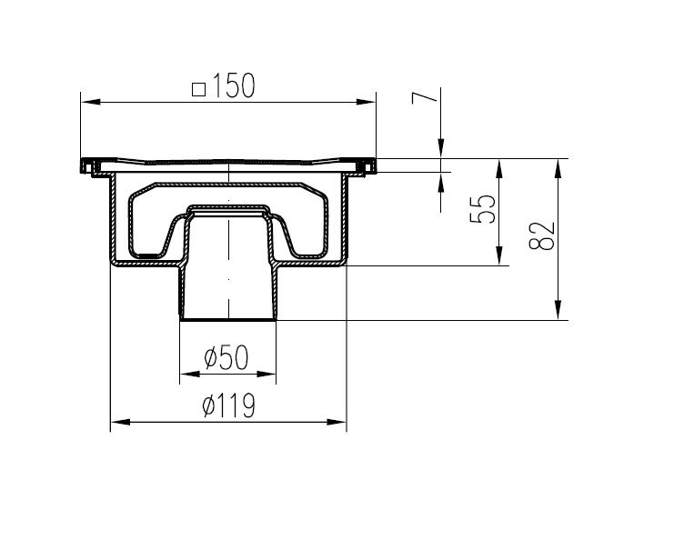 Chudej Dolny odpływ podłogowy D50 wys. 82, 150x150, kratka, stal nierdzewna Kod 320XN