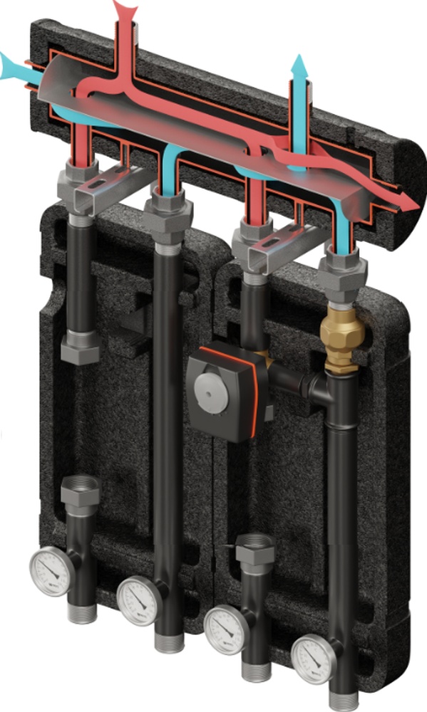 Zestaw hydrauliczny na 2 grupy pompowe Brygada 410, bez funkcji sprzęgła z kierownicą przepływu Inox. W zestawie kolektor rozdzielający KRE 2D+, grupa pompowa UNI bez pompy, grupa pompowa z zaworem obrotowym VRG 432 bez pompy obiegowej, z siłownikiem ARA.