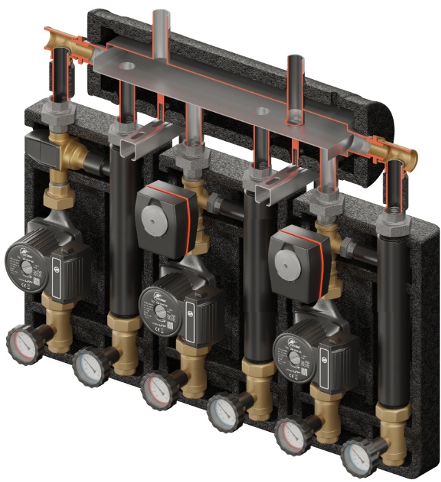 Zestaw hydrauliczny na 3 grupy pompowe Brygada PRO 9344, z termometrami z zaworami kulowymi i zwrotnymi, rozdzielacz bez funkcji sprzęgła z kierownicą przepływu Inox. W zestawie kolektor rozdzielający KRE 3D, grupa pompowa z zaworem termostatycznym VTA322 z pompą obiegową Grundfos DN25, 2x grupa pompowa z zaworem obrotowym VRG432 z siłownikiem ARA z pompą obiegową Grundfos DN25.