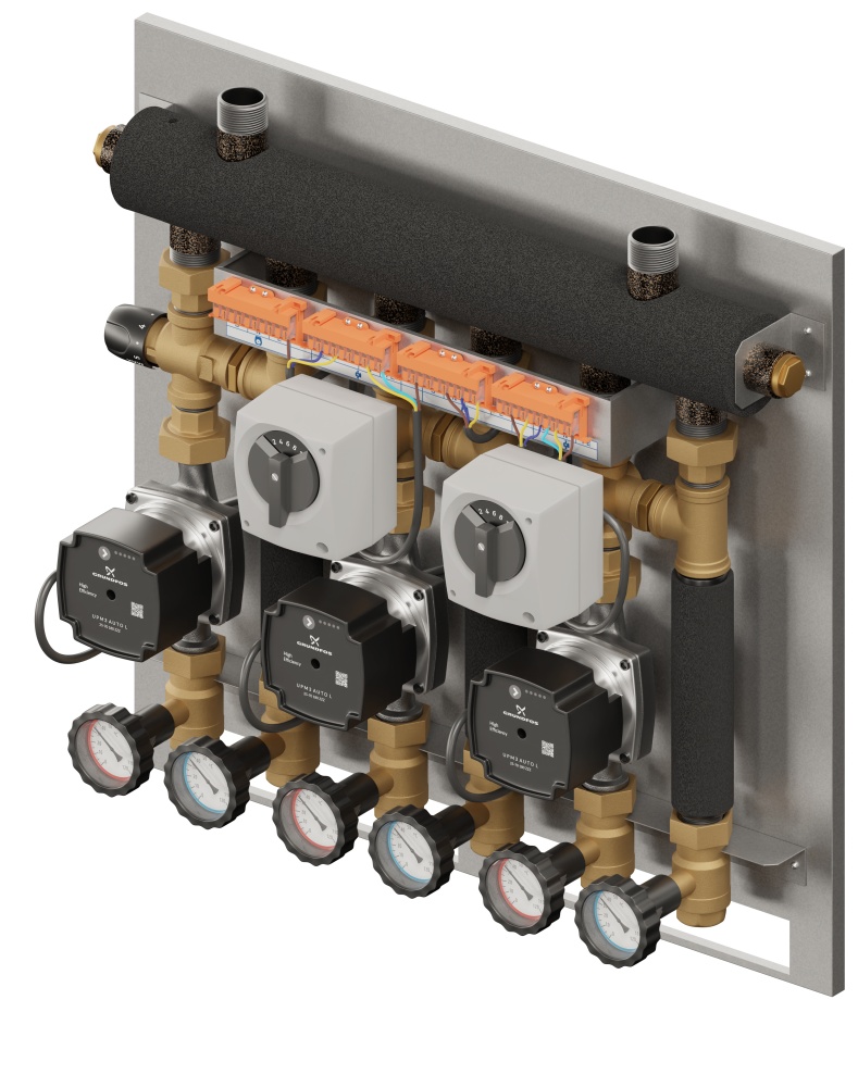 Zabudowany zestaw hydrauliczny Eskadra 3D+ 8433 na 3 grupy pompowe z kolektorem rozdzielającym. W zestawie: kolektor rozdzielający KRE 3D+, 2x grupa pompowa z zaworem obrotowym, siłownikiem i pompą LFP DN 15, grupa pompowa z zaworem mieszającym termostatycznym i pompą LFP DN 15.