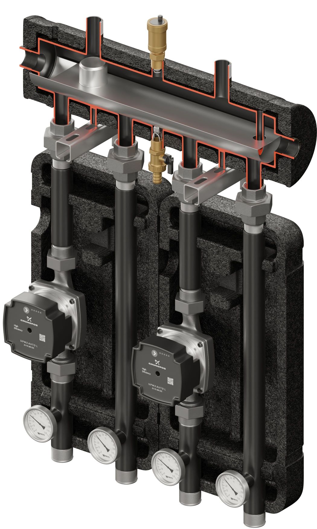 Zestaw hydrauliczny na 2 grupy pompowe z funkcją sprzęgła KOMPANIA 2D+ 050. W zestawie: sprzęgło-kolektor SKE 2DC+, dwie grupy pompowe UNI z pompami LFP DN25.