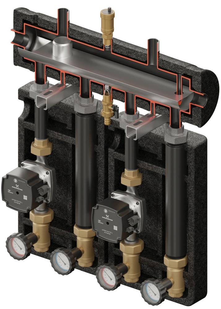 Zestaw hydrauliczny na 2 grupy pompowe z funkcją sprzęgła KOMPANIA 2D+ PRO 050. W zestawie kolektor rozdzielający SKE, 2x grupa pompowa UNI z pompami LFP DN25