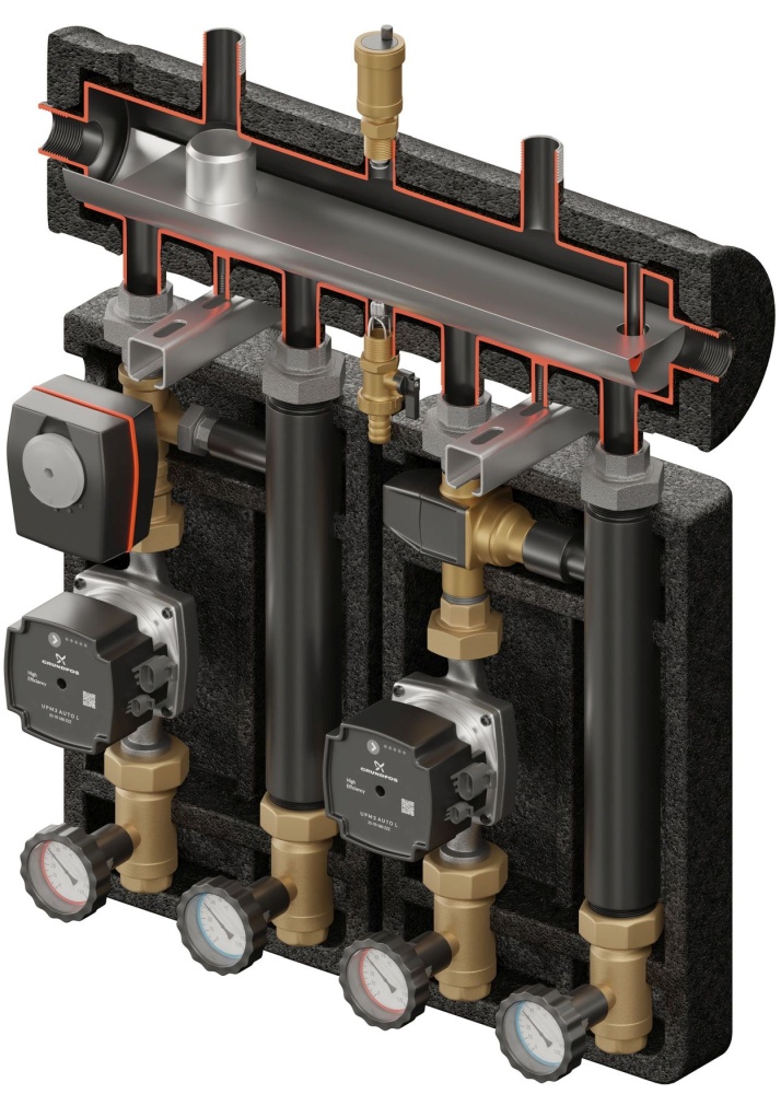 Zestaw hydrauliczny na 2 grupy pompowe z funkcją sprzęgła KOMPANIA 2D+ PRO 584. W zestawie kolektor rozdzielający SKE, grupa pompowa VTA 372 z zaworem termostatycznym Kvs 3,4 od 40 do 140 m2, grupa pompowa VRG432 z zaworem obrotowym progresywnym 3 drogowym Kvs do 8.0, siłownik ARA oraz pompy Grundfos DN25.