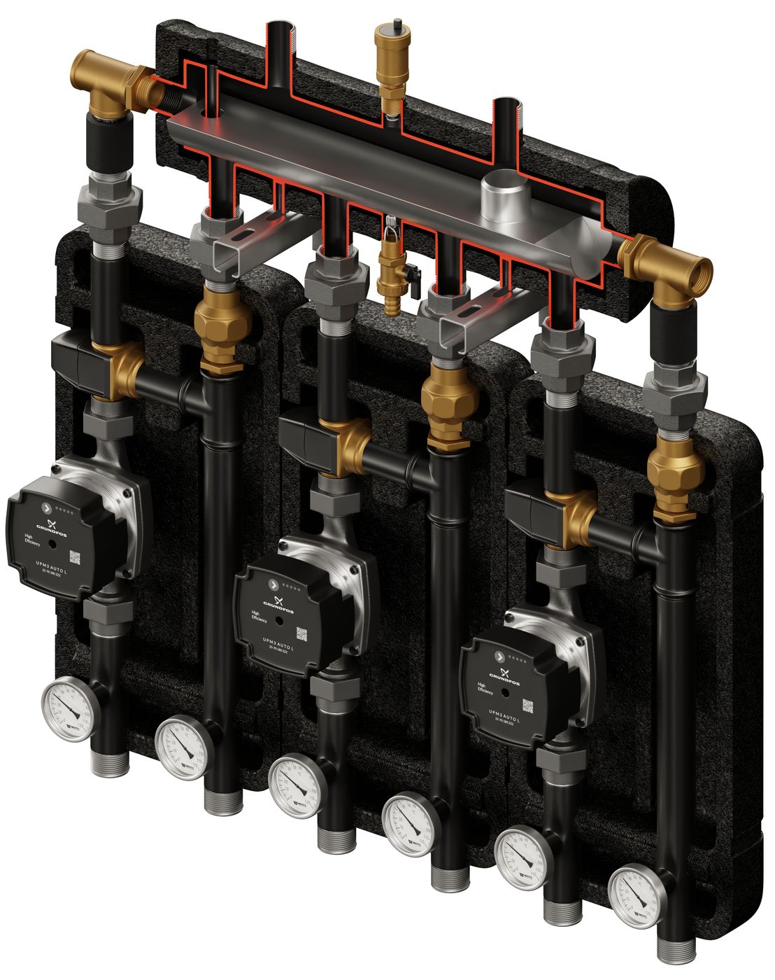 Zestaw hydrauliczny na 3 grupy pompowe z funkcją sprzęgła KOMPANIA 3D+ 9333. W zestawie kolektor rozdzielający SKE, 3x grupa pompowa z zaworem termostatycznym VTA 322 z pompą obiegową Grundfos DN25.