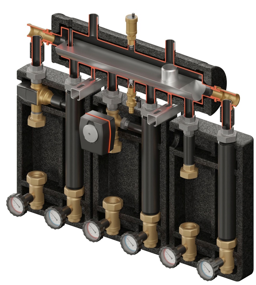 Zestaw hydrauliczny na 3 grupy pompowe z funkcją sprzęgła KOMPANIA 3D+ 7054. W zestawie kolektor rozdzielający SKE, grupa pompowa UNI, grupa pompowa VTA372 z zaworem termostatycznym 1" Kvs 3,4 od 40 do 140 m2 oraz grupa pompowa VRG432 z zaworem obrotowym progresywnym 3-drogowym Kvs do 8,0 i siłownikiem ARA.
