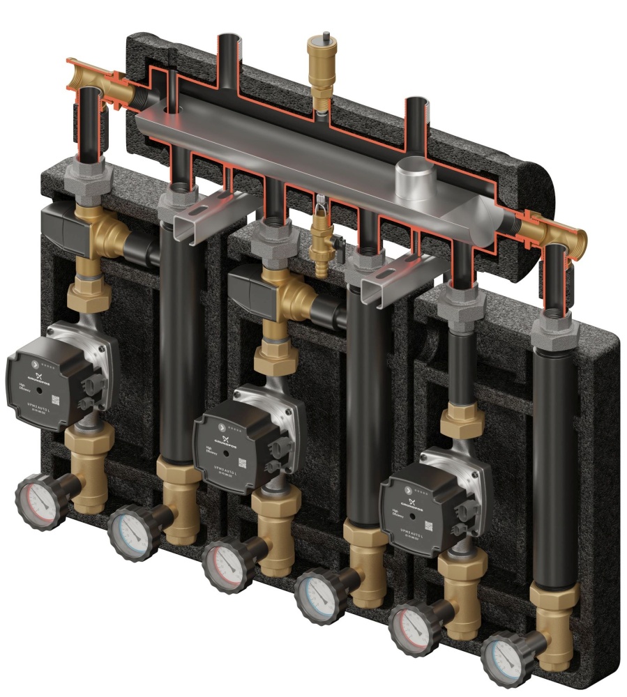Zestaw hydrauliczny na 3 grupy pompowe z funkcją sprzęgła KOMPANIA 3D+ 9033. W zestawie kolektor rozdzielający SKE, grupa pompowa UNI, grupa pompowa VTA322 z zaworem termostatycznym 1" Kvs 1,6 do 60 m2 oraz 3x pompy Grundfos DN25.