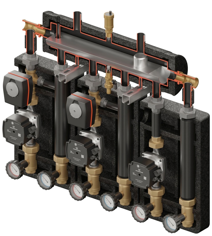 Zestaw hydrauliczny na 3 grupy pompowe z funkcją sprzęgła KOMPANIA 3D+ 9044. W zestawie kolektor rozdzielający SKE, grupa pompowa UNI, 2x grupa pompowa VRG432 z zaworem obrotowym progresywnym 3-drogowym Kvs do 8,0, 3x pompy Grundfos DN25 oraz 2x siłownik ARA.
