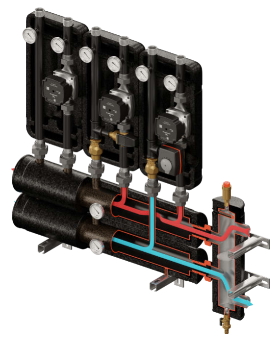 Kompaktowy rozdzielacz KRE PRO służy do odseparowania obiegu kotłowego na odpowiednią ilość obiegów grzewczych.