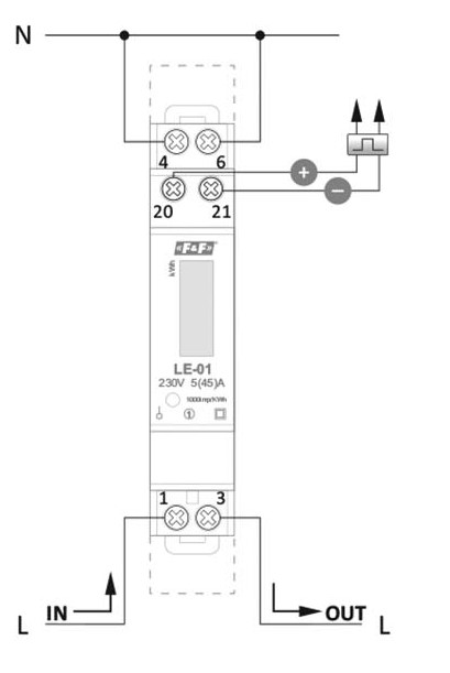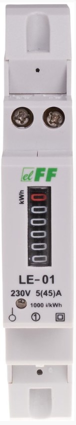 LE-01 jest statycznym (elektronicznym) wzorcowanym wskaźnikiem zużycia energii elektrycznej prądu przemiennego jednofazowego w układzie bezpośrednim, Jednofazowy, Prąd 45 A, IP20