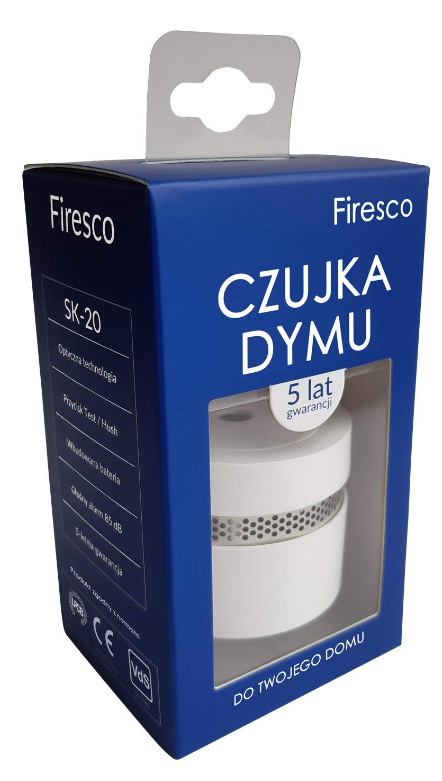 Firesco Optyczna czujka dymu model SK-20, optyczno-akustyczna sygnalizacja alarmowa (syrena o sile 85 dB w odległości 3 m, migająca dioda LED)