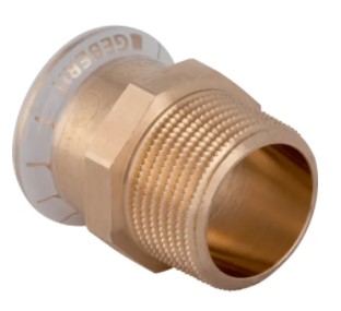 Złączka przejściowa z gwintem zewnętrznym Mapress Kupfer, 15x1/2", materiał: Brąz (CuSn5Zn5Pb2-C), Mufa zaprasowywana z przeźroczystą zaślepką ochronną