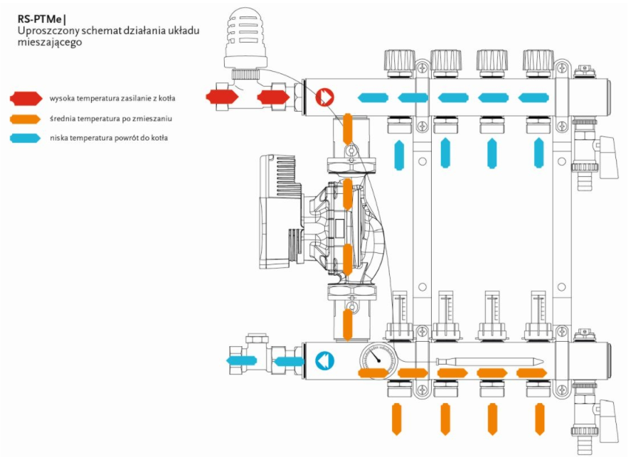 RS PTMe | Rozdzielacz stalowy z układem mieszającym, przepływomierzami, zaworami termostatycznymi, materiał: stal, Bezdławnicowa pompa obiegowa z korpusem żeliwnym, Liczba sekcji 10