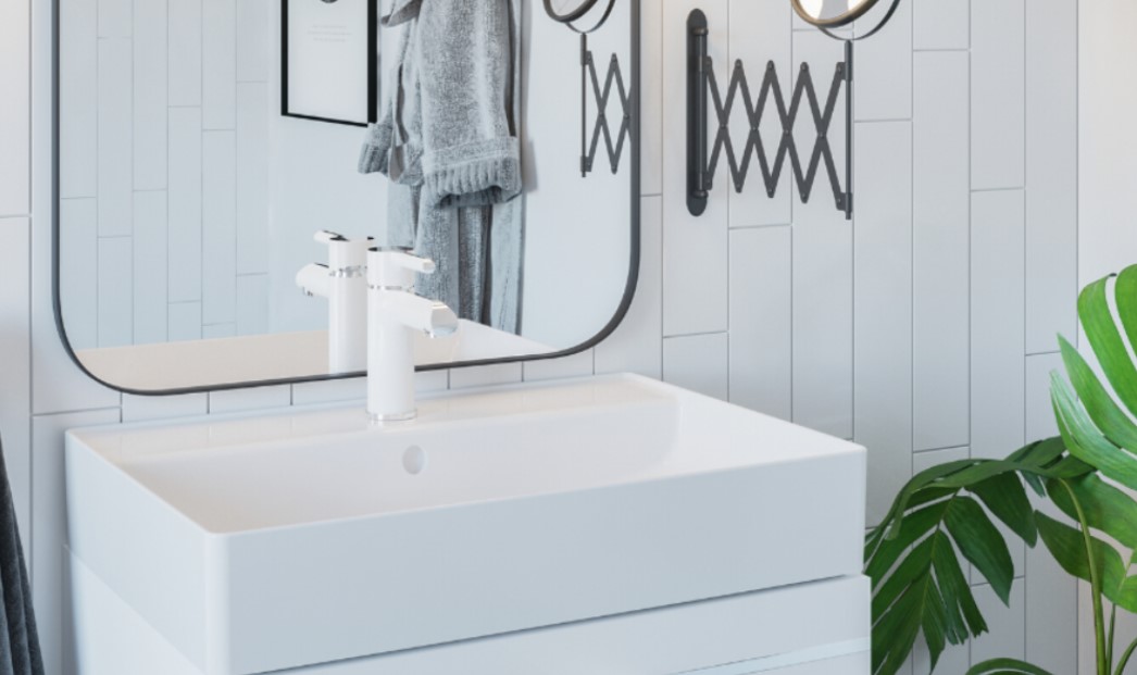 Bateria umywalkowa stojąca, kolor biały-chrom, spust klik-klak duży z przelewem, regulator ceramiczny Ø40,  Dł. wylewki 107 mm, 10 lat gwarancji