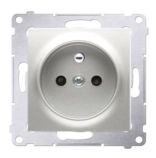 Gniazdo pojedyncze, z uziemieniem, przesłonami otworów prądowych, srebrne matowe, metalizowane.
