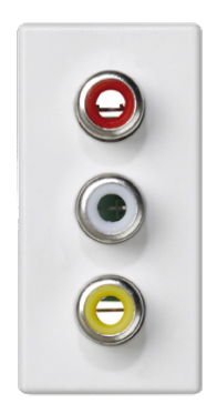Kontakt Simon, seria K45, Płytka złącza 3× RCA (CINCH), wymiary 45×22,5mm, kolor czysta biel, wykończenie matowe, montaż pionowy na zatrzaski.