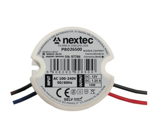 Nextec Slim Zasilacz LED wodoodporny okrągły dopuszkowy 12V/1,25A o mocy 15W Kod 5908293926500