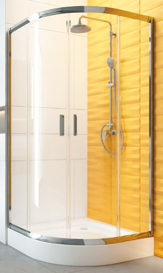 Kabina prysznicowa dwudrzwiowa rozsuwana, półokrągła 90cm, promień łuku 550mm, wysokość 185cm, bezpieczne szkło hartowane 5mm - transparentne, wykończenie chrom, ciche zamknięcie, uszczelki magnetyczne, uszczelki piórowe na szybach stałych i ruchomych