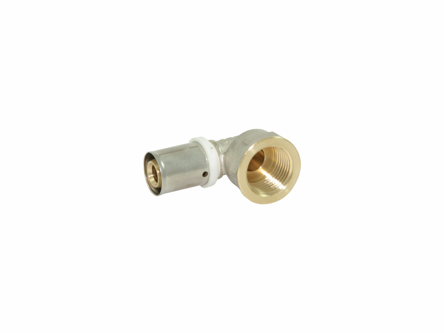 Onnline Kolano 90° zaprasowywane, gwint wewnętrzny, 25 mm x 1 cal, korpus mosiężny, gniazdo tulei wykonane z polipropylenu, a o-ring doszczelniające z EPDM.