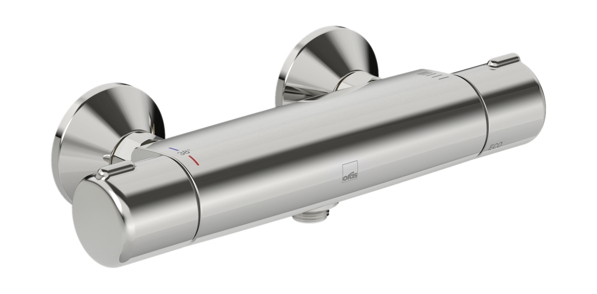 Termostatyczna bateria natryskowa. Zawiera mimośrody i rozety. Pokrętło temperatury wyposażone w ogranicznik ustawiony na 38°C.