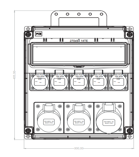 OPOLE Rozdzielnica stacjonarna, 1xCEE 32A/5P 400V, 2xCEE16A/5P 400V, 5xGS 16A 230V, IP54, pokrywa prosta, jedno okienko inspekcyjne 14 modułowe, przenośna z rączką