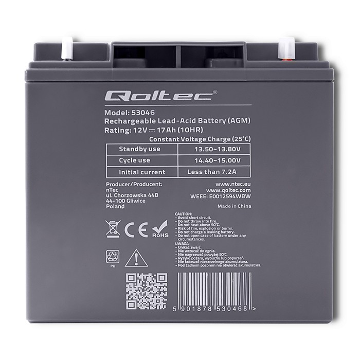 Qoltec Akumulator AGM, 12 V, 17 Ah, max 255 A, KOD 53046