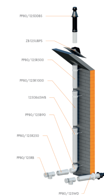 PAL Trójnik koncentryczny, rewizyjny z odprowadzaniem kondensatu fi 80/125, materiał PP, z uszczelką EPDM, do kotłów kondensacyjnych