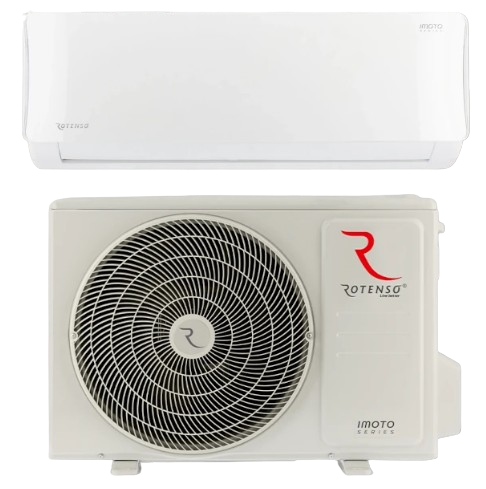 Rotenso Imoto Zestaw klimatyzator jednostka wewnętrzna o mocy 3,5 kW + jednostka zewnętrzna o mocy 3,5 kW. Stanowią komplet. Filtry: HEPA, Cold Nano, elektrostatyczny HD, super Jonizator iAIR, system automatycznego nawiewu 4D. Posiada pakiet dla pracy całorocznej: grzałka tacy ociekowej + grzałka karteru sprężarki.