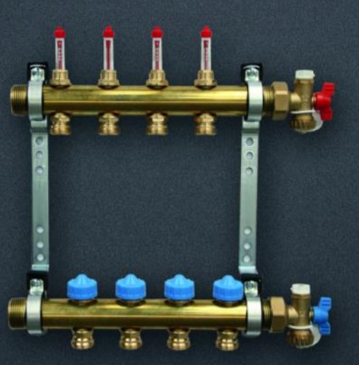 Rozdzielacz obwodów grzewczych z przepływomierzami, zawory+ końcówki, materiał: mosiądz, 6-obiegowy, przyłącze 3/4", odstęp w osiach pomiędzy zaworami 54 mm