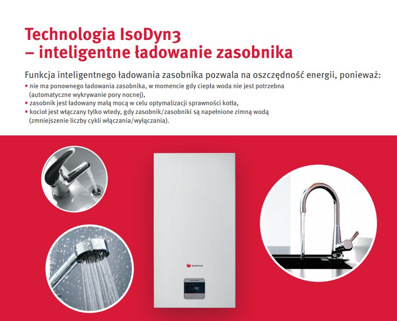 Saunier Duval Wiszący Kocioł gazowy Isofast 21 condens T26-CS/1 (N-PL), zakres mocy 2,8 … 21,9 kW, zasobnik 21L ze stali nierdzewnej, funkcja inteligentnego ładowania zasobnika IsoDyn3+ MiPro Sense SRC 720 regulator pogodowy, przewodowy, tygodniowy, dotykowy panel sterowania