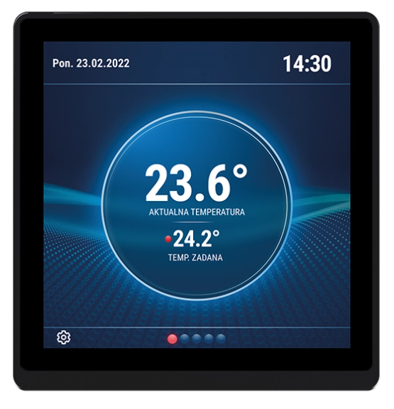 Komunikacja przewodowa TECH SBUS. Panel może zastąpić tradycyjne włączniki. Pozwala na regulację temperatury, wyświetlanie prognozy pogody, utworzenie skrótów dowolnych akcji (np. otwórz bramę, zamknij rolety) i wyświetlenie parametrów dowolnych czujników z systemu Sinum. Zasilanie: 24 V DC. Pobór mocy: 1 W. Zakres temperatury: 5-50°C. Kolor: czarny