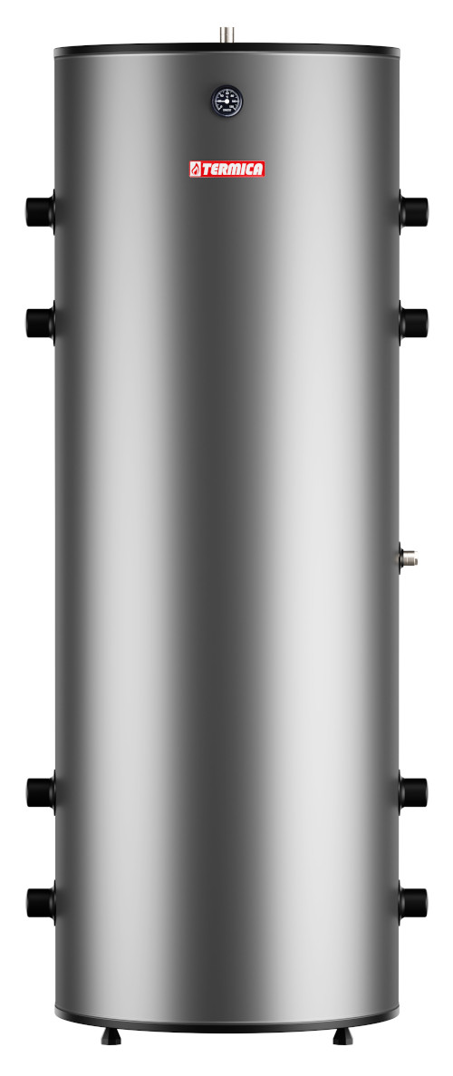 Termica 500 L Zasobnik buforowy do pomp ciepła z ośmioma mufami 6/4cala. Zbiornik wykonany ze stali nierdzewnej. Wysokiej klasy zdejmowalna obudowa w kolorze białym lub szarym. W cenie zawór bezpieczeństwa, termometr.