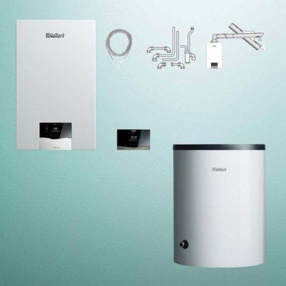 Pakiet VC 25CS/1-5 ecoTEC plus Kocioł gazowy kondensacyjny jednofunkcyjny z zasobnikiem Vaillant uniSTOR VIH R 150/6B , zestawem połączeniowym nadtynkowym z czujnikiem temperatury c.w.u., sterownikiem VRC 720F sensoCOMFORT oraz poziomym wyprowadzeniem przez dach lub ścianę.