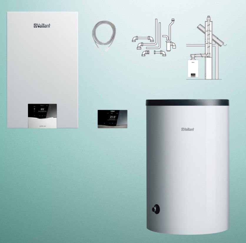 Pakiet VC 30CS/1-5 ecoTEC plus Kocioł gazowy kondensacyjny jednofunkcyjny z zasobnikiem Vaillant uniSTOR VIH R 200/6B , zestawem połączeniowym nadtynkowym z czujnikiem temperatury c.w.u., sterownikiem VRC 720 sensoCOMFORT oraz zestawem do szachtu