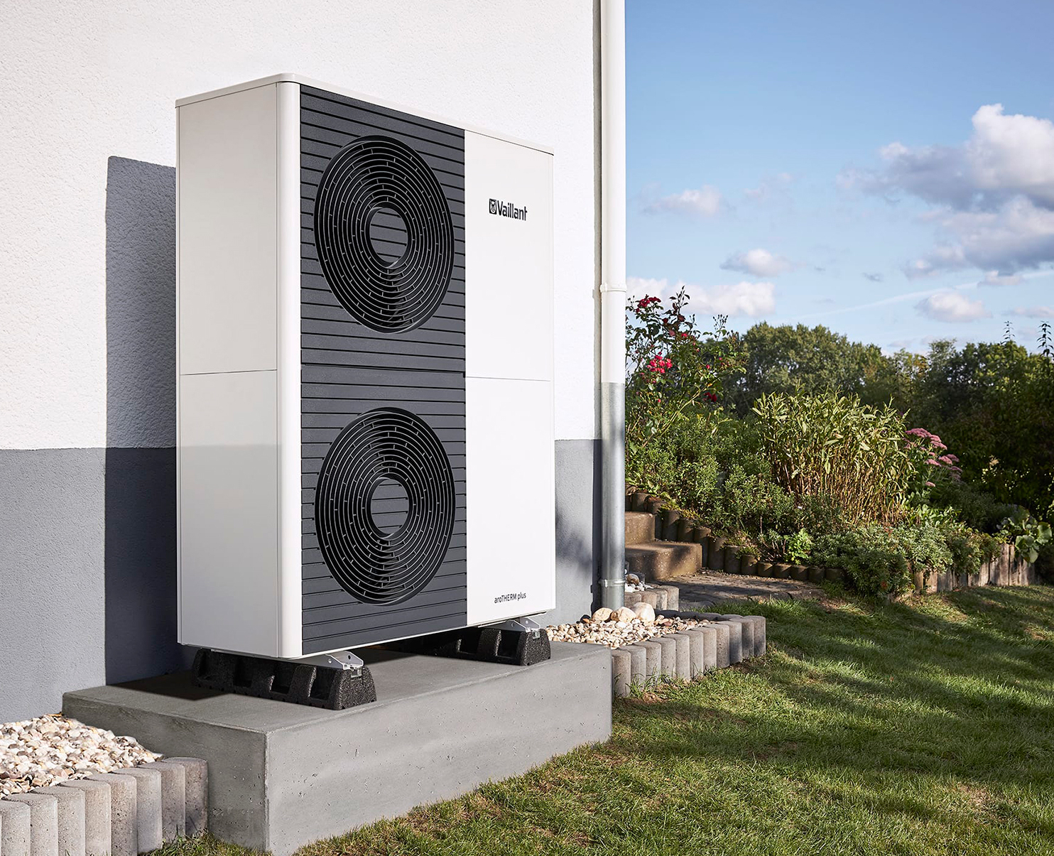 Zestaw składający się z pompy ciepła powietrze/woda monoblok aroTHERM plus VWL 125/6 A, centrali grzewczej VIH QW 190/6E uniTOWER plus, zbiornika buforowego VP RW 100/3 B, regulatora pogodowego sensoCOMFORT VRC 720 oraz stóp amortyzujących.