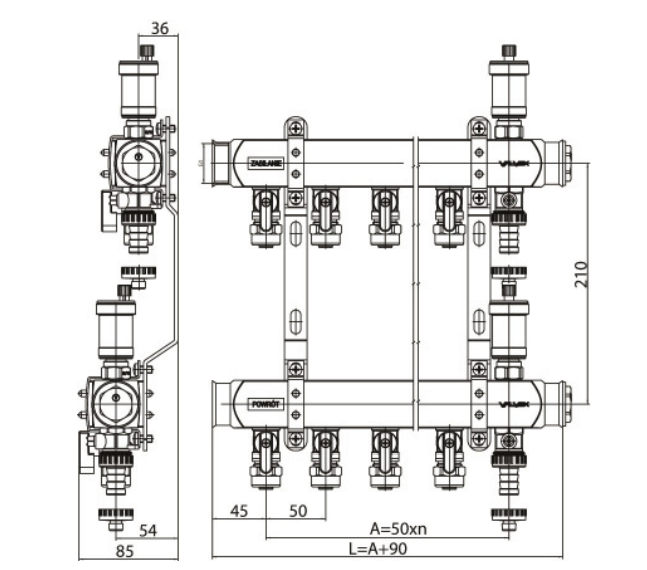 VALVEX K2-5 BASE INOX Zespół rozdzielaczy K2 mini G1-G1/2, 5 obiegów Kod 6084030