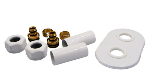 Zestaw maskujący z podwójną rozetą, kolor biały, rozeta maskująca zespolona 3/4", 2x tulejki maskujące, 2x złączki PEX, 2x wkładki silikonowe
