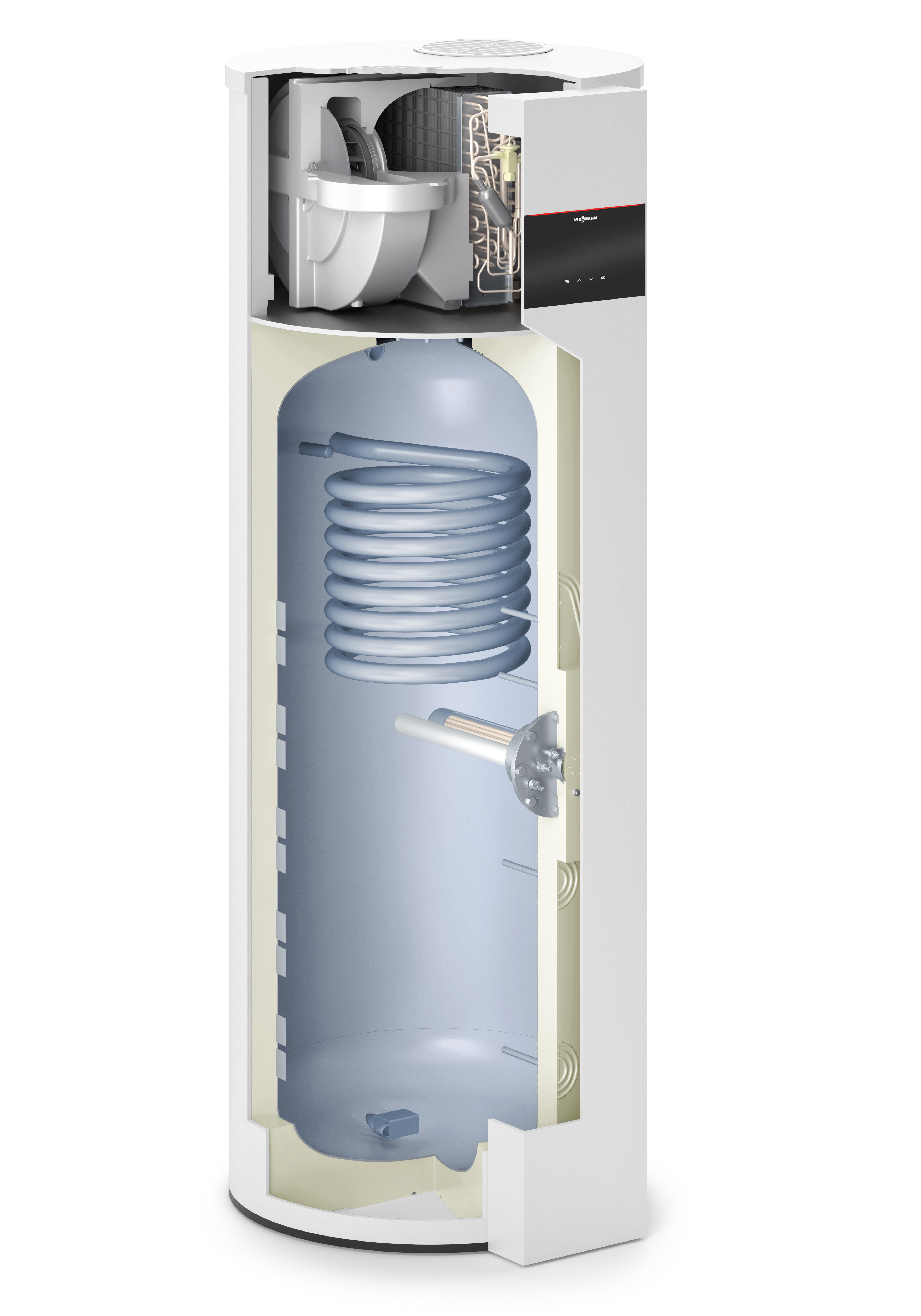 Pompa ciepła powietrze/woda do podgrzewu c.w.u. z naturalnym czynnikiem chłodniczym R290, do pracy z powietrzem obiegowym lub zewnętrznym (adapter jako wyposażenie dodatkowe), ze zintegrowanym podgrzewaczem c.w.u. o pojemności 291 litrów i wężownicą do podłączenia drugiego źródła ciepła.