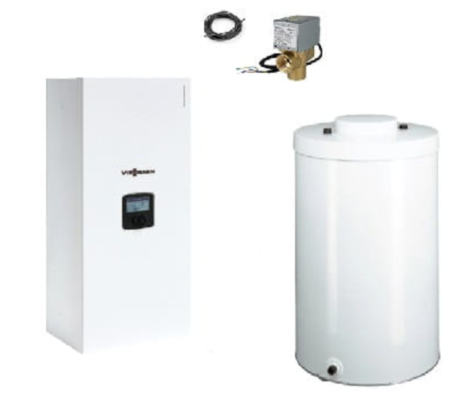 Viessmann VITOTRON 100 VMN3 Kocioł elektryczny wiszący do pracy sterowanej zależnie od pogody w pakiecie z podgrzewaczem c.w.u. Vitocell 100-W CUGB 150 litrów (klasa B), 3-drogowym zaworem z napędem elektrycznym 1” GW oraz czujnikiem temperatury c.w.u., Moc znamionowa od 12 do 24kW, Regulator pogodowy, czujnik temperatury zewnętrzenej i temperatury pomieszczenia (przewodowy), Przeponowe Naczynie wzbiorcze o pojemności 5 litrów (3 bar), Panel sterowania umożliwiający regulację temperatury wody w obiegu c.o. w zakresie od 20 do 85°C, Kocioł może współpracować z dowolną instalacją c.o. oraz z wymiennikiem c.w.u, Automatyczna modululacja mocy grzałek, Możliwa współpraca z kotłem na paliwa stałe lub kominkiem oraz z instalacją fotowoltaiczną, Napiecie zasilania 400V ~.Całkowice okablowany.