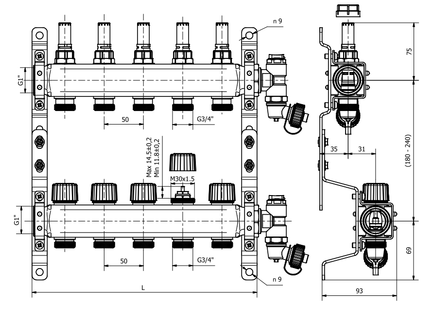 Rozdzielacz do ogrzewania płaszczyznowego na 2 obwody grzewcze, z nyplami redukcyjnymi 1/2” x 3/4”, z wkładkami termostatycznymi i rotametrami o przepływie 0-2,5 l/min, 2 odpowietrznikami oraz zaworami spustowymi kątowymi Maks. temp.: 70 °C. Maks. ciśnienie pracy: 6 bar. Przyłącze wkładki: M30x1,5. Medium: woda lub roztwór wody i glikolu do 30%.