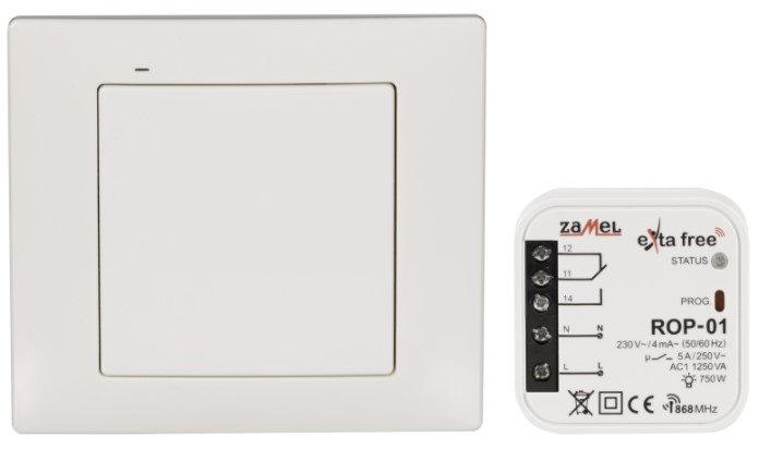 ZAMEL, seria Exta Free, Zestaw sterowania bezprzewodowego: odbiornik radiowy ROP-01 do montażu w puszkach pod- i natynkowych oraz nadajnik RNK-02.