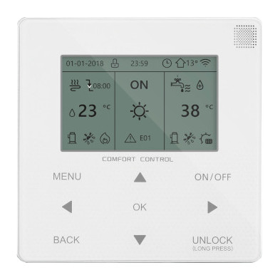 Pompa ciepła monoblok o mocy 10 kW, jednofazowa, czynnik chłodniczy R32, wskaźnik COP: 5,15, łączność Modbus umożliwia sterowanie ogrzewaniem/chłodzeniem pomieszczeń i produkcję ciepłej wody w zasobniku, sprężarka rotacyjna z technologią DC-Inverter.