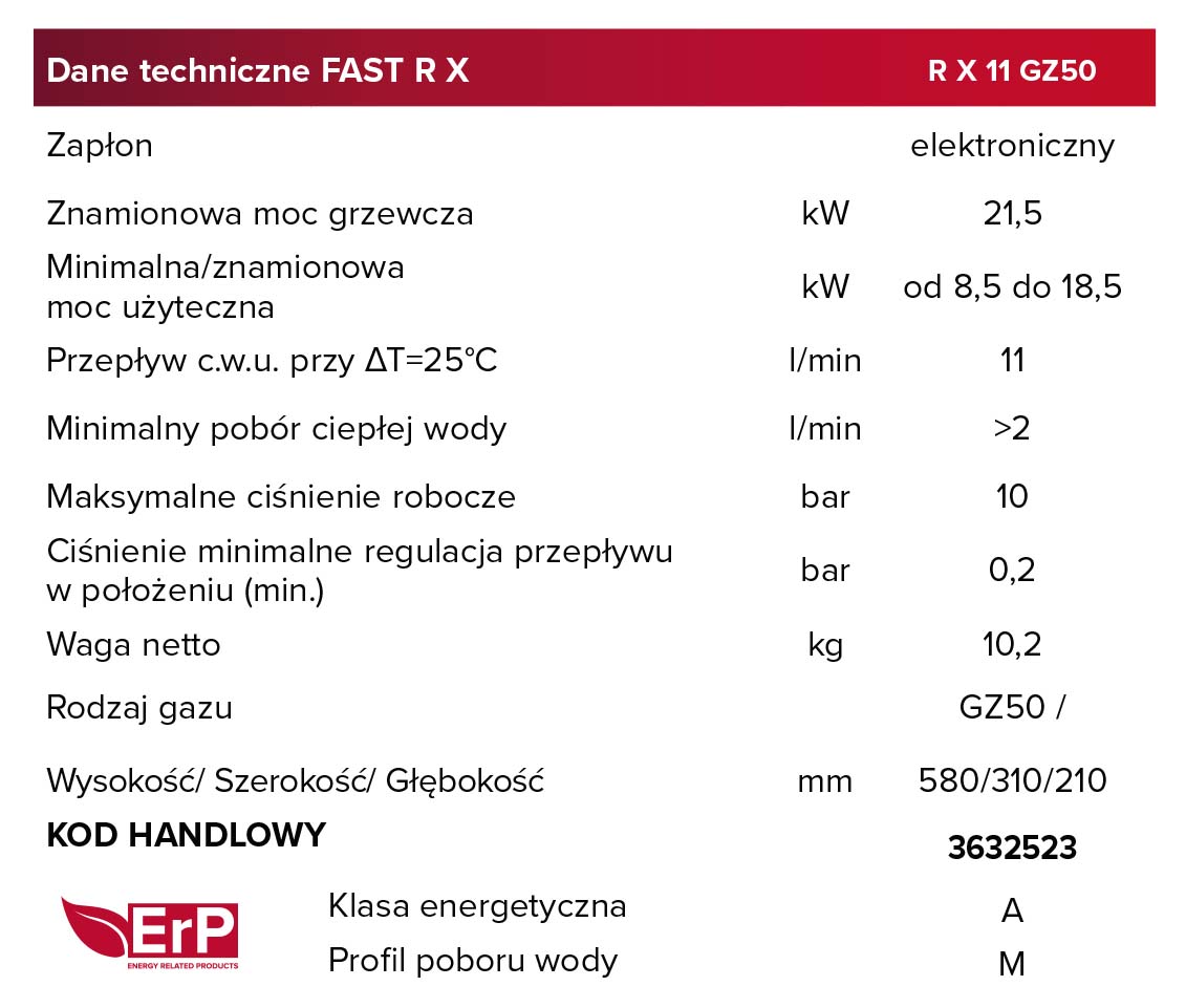 Kod produktu: 3632523Ariston Terma gazowa FAST R X 11 - NG, gazowy przepływowy podgrzewacz wody, zapłon elektroniczny, GZ50, 21.5 kW mocy grzewczej, 11 l/min przy 25*C, maks. 10 bar, min. 0.15 bar