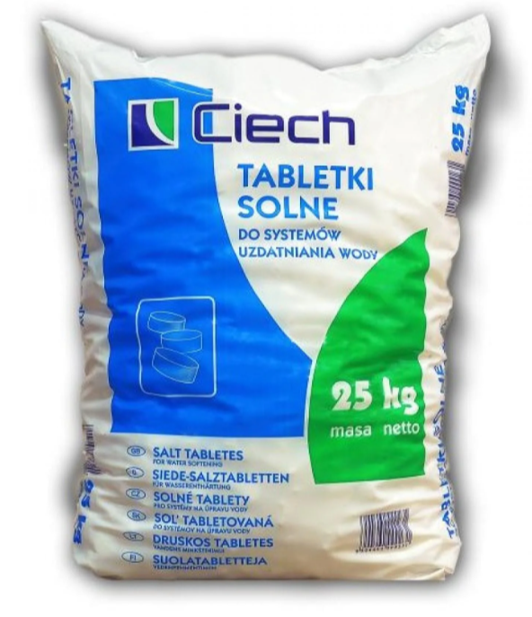 Tabletki solne - stosowane są w systemach zmiękczania wody, m.in. do regeneracji wymienników jonitowych, zmiękczaczy wody i filtrów multifunkcyjnych, które wychwytują składniki powodujące twardość wody (wapń i magnez), 25kg